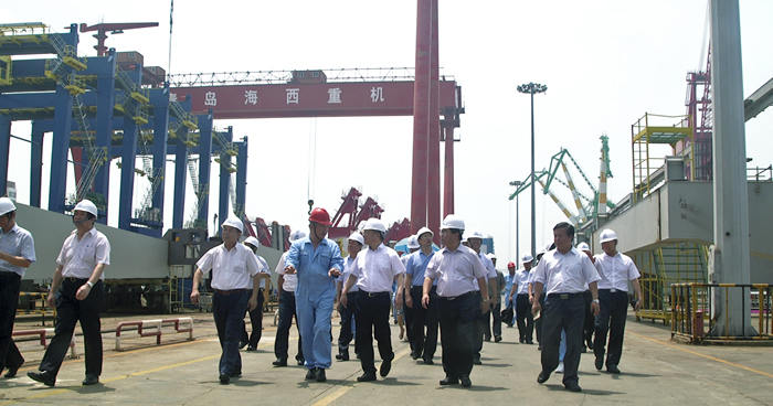 在海西重機(jī)總裝現(xiàn)場,張德平副市長實(shí)地考察了待批量發(fā)往黎巴嫩的岸橋和輪胎吊項(xiàng)目、發(fā)往馬來西亞的帶斗門機(jī)項(xiàng)目、發(fā)韓國鮮光新港的軌道吊項(xiàng)目及承制、調(diào)試的功能性海工平臺(tái)項(xiàng)目等。并聽取了海西重機(jī)董事長孫國慶關(guān)于企業(yè)上半年經(jīng)濟(jì)運(yùn)行情況、轉(zhuǎn)型升級(jí)取得的成績以及在目前經(jīng)濟(jì)形勢下的合同承接情況。