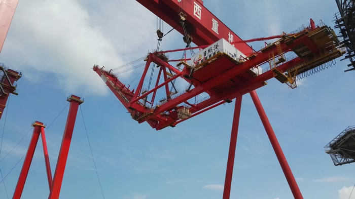 公司生產(chǎn)基地參觀同樣火爆:適逢總裝現(xiàn)場70T-60M岸邊集裝箱起重機項目整體吊裝, 1600T龍門吊平穩(wěn)吊起850噸的前后大梁、緩緩上升、精準定位、穩(wěn)穩(wěn)落于該岸橋的門框上,現(xiàn)場高效的安裝工藝,給了在場的400余嘉賓巨大的視覺沖擊,掌聲、贊美聲陣陣不斷。公司整體室內噴涂的涂裝工藝、超大型設備整機滾裝運輸?shù)能浻布嵙σ沧寘⒂^嘉賓耳目一新。