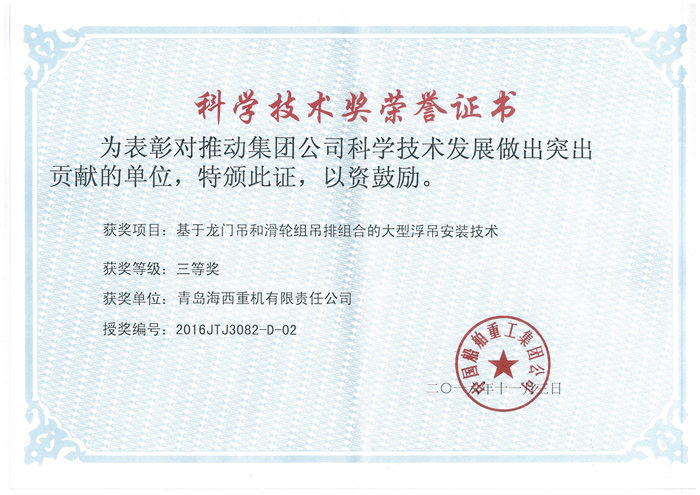 近日,集團公司再傳喜訊,海西重機《基于龍門吊和滑輪組吊排組合的大型浮吊安裝技術(shù)》榮獲中國船舶重工集團公司2016年度科學(xué)技術(shù)三等獎,科技研發(fā)再下一城,創(chuàng)新成果錦上添花。