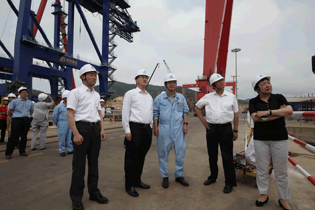 楊軍一行參觀了海西重機港口設備總裝現(xiàn)場,并重點參觀了在建的阿聯(lián)酋110米桁架自升式海工平臺,聽取了海西重機董事長鄧振山對公司目前生產(chǎn)經(jīng)營形勢、生產(chǎn)負荷情況等方面的介紹,對海西重機在國際海工平臺市場上所取得的成績給予了肯定。