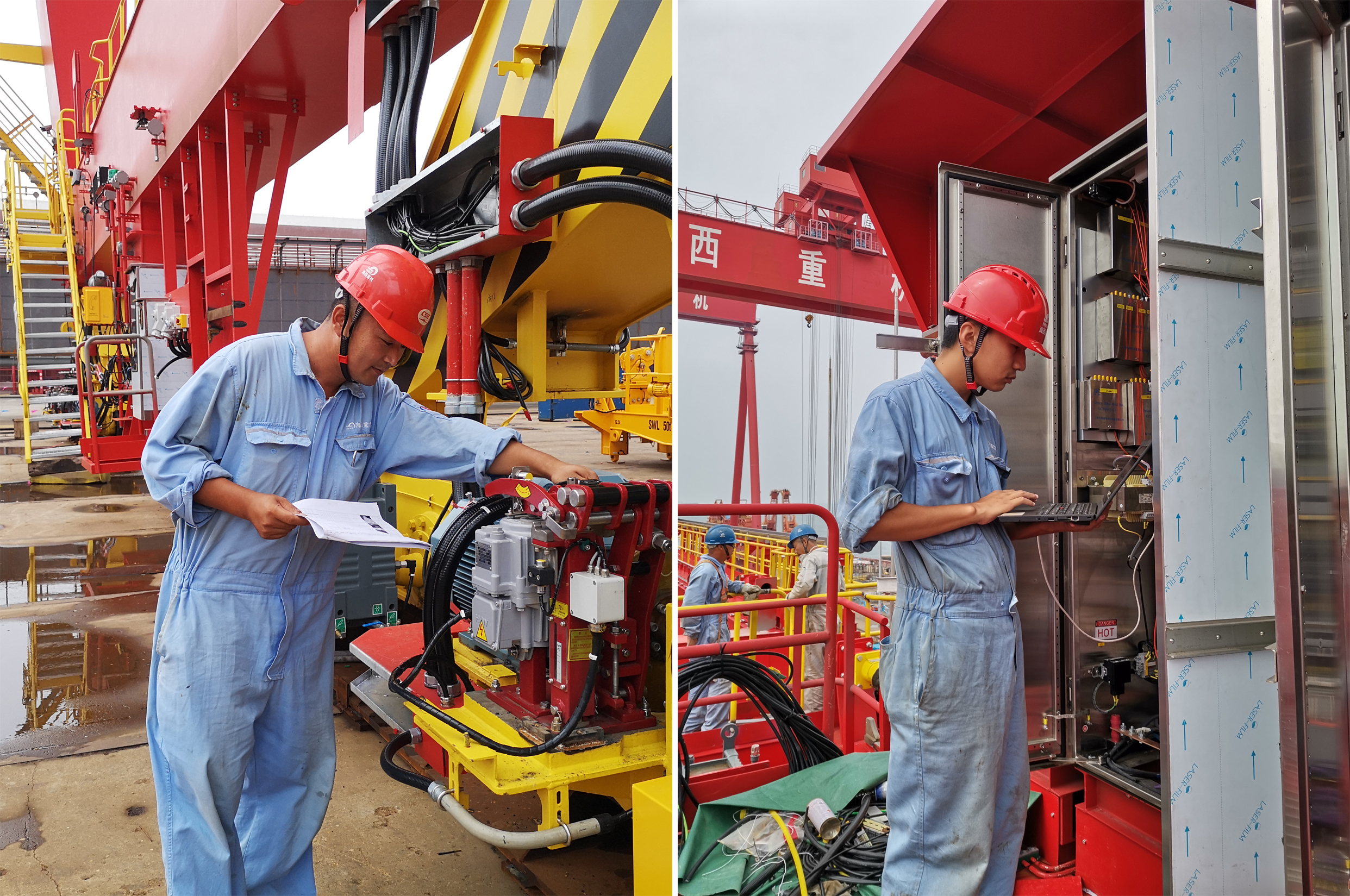 為了保障日照港集裝箱自動(dòng)化堆場(chǎng)(一期)作業(yè)100萬標(biāo)箱儀式重大活動(dòng)的順利召開,海西重機(jī)接到用戶10臺(tái)自動(dòng)化軌道吊徽標(biāo)涂改需求后,項(xiàng)目管理部便及時(shí)安排涂裝部組織人員及準(zhǔn)備設(shè)備設(shè)施,涂裝部不等不靠,組織施工人員連夜趕往日照港現(xiàn)場(chǎng),現(xiàn)場(chǎng)負(fù)責(zé)人李春鵬帶領(lǐng)施工人員,克服工期緊、任務(wù)重、施工難度大的困難,積極發(fā)揮主觀能動(dòng)性,攻堅(jiān)克難,在確保安全、質(zhì)量前提下,連續(xù)3晚工作到后半夜,如期完成設(shè)備徽標(biāo)涂改全部工作,保障儀式順利召開。
