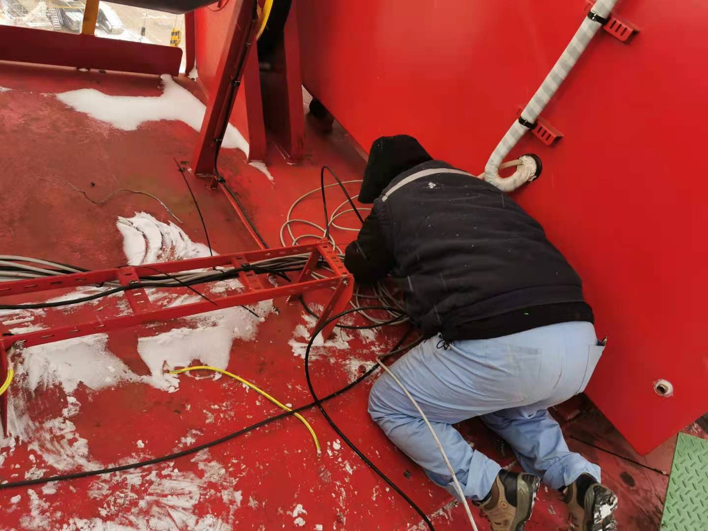 自2020年12月31日開始,為了追趕進(jìn)度,我們團(tuán)隊頂著冷風(fēng),放棄休息時間,把臂架到機房、司機室、電氣房的電纜敷設(shè)下來,進(jìn)行捆扎。為了與船廠穿鋼絲錯開,吃飯的時間點總是往后推遲。甚至為了節(jié)省時間,自己提前帶好面包,中午簡單吃點,為的就是把工作搶一搶,看著已經(jīng)穿到位的電纜,不禁感嘆隊友們的拼勁兒。