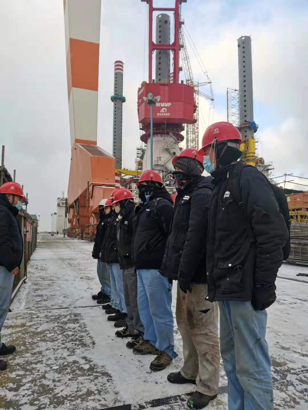 1月7日,山東經(jīng)歷了一次罕見的寒潮,煙臺下起了雪,這是第二場雪,也是我們要克服的又一個惡劣天氣,寒風(fēng)里摻雜著雪,氣溫也是零下好幾度。一如既往的早班會,特意強調(diào)一下安全,然后根據(jù)現(xiàn)場情況,交代好工作,我們就整裝上陣,開始一天工作?,F(xiàn)場的問題在一個一個解決,堅定了我們的信心。我常常鼓勵大家,“咱們再辛苦辛苦,早日結(jié)束?!标犛褌円矔唵位匾痪渑牡脑?,“這都不是事,我們都想早點干完。”