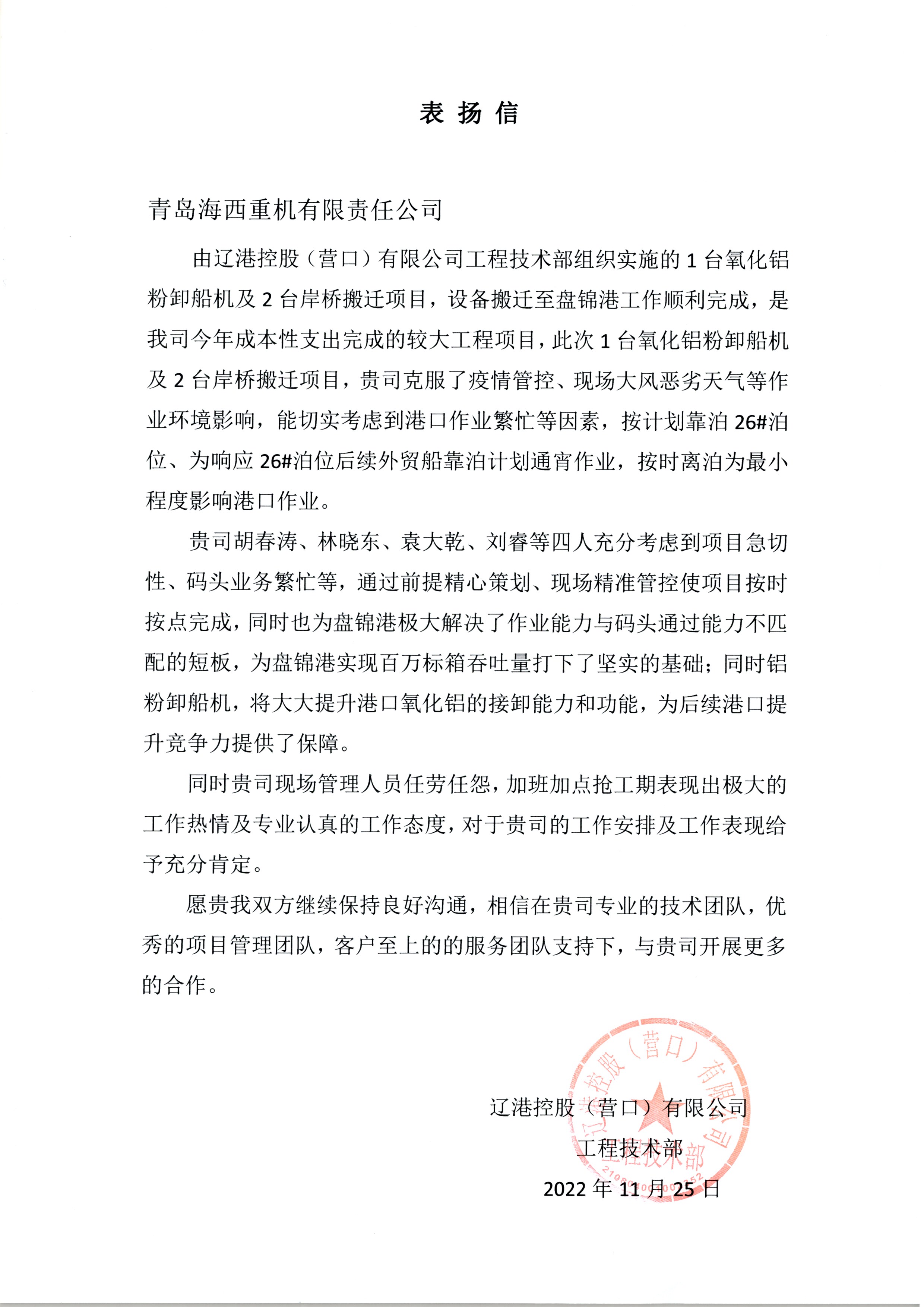 項(xiàng)目施工期間,正值當(dāng)?shù)匾咔榉揽鼐o張之時(shí),經(jīng)過溝通協(xié)調(diào),在遼港控股、盤錦港集團(tuán)的大力支持下,特批了綠色通道,提供港內(nèi)食宿。項(xiàng)目攻關(guān)小組所有人員均食宿在碼頭,克服大風(fēng)、寒潮等惡劣天氣以及疫情帶來的不利因素,經(jīng)過20多天的晝夜奮戰(zhàn),設(shè)備最終安全高效、保質(zhì)保量的交付客戶使用。專業(yè)的人干專業(yè)的事,整個(gè)項(xiàng)目搬遷工作得到了客戶的充分肯定和贊揚(yáng)。