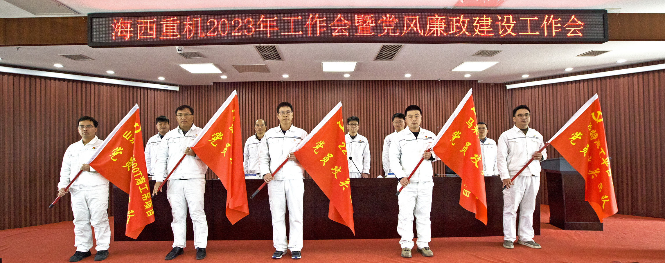 為將黨建工作優(yōu)勢轉(zhuǎn)化生產(chǎn)經(jīng)營工作優(yōu)勢,充分釋放黨建工作“紅利”,進一步推動黨建工作與生產(chǎn)經(jīng)營工作深度融合,針對2023年生產(chǎn)任務繁忙,會上還針對山東海洋1500T風電安裝平臺1500t起重機項目、深圳大鏟灣項目、550T門機項目、馬來西亞古晉港2臺岸橋、沙特海工輔助生活平臺等5個重難點項目成立黨員攻關團隊,并開展授旗儀式,確保各項任務保質(zhì)按期完成。