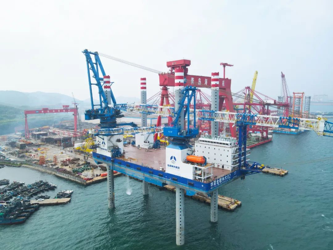 華夏金租神大02號1200噸風電安裝平臺于2022年8月21日開工建造,2023年6月30日到達青島,2023年8月21日完成試航。到達青島海西后,項目組成員在01號平臺成功交付的基礎(chǔ)上,采取扎實有效的措施,狠抓生產(chǎn)組織與過程控制,僅用了不到3個月的時間就完成主輔吊機安裝、樁腿接樁、系泊試驗、試航等主要工作,提前合同交貨期交船,向用戶交上了一份滿意的答卷。