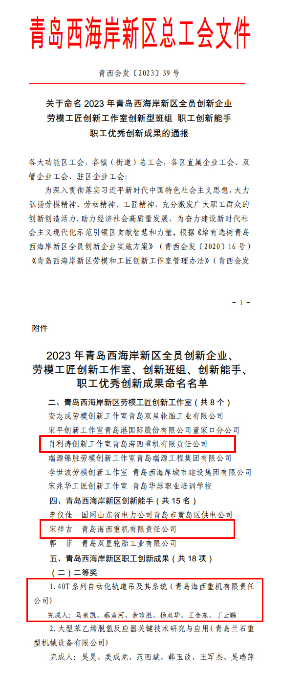 此次評選工作由青島西海岸新區(qū)總工會組織開展,經(jīng)過海西重機基層工會推薦,資料申報、西海岸新區(qū)總工會資格審查、專家組評審,區(qū)總工會現(xiàn)場考察、會議研究及社會公示等環(huán)節(jié),最終“肖利濤創(chuàng)新工作室”榮獲西海岸新區(qū)“勞模工匠創(chuàng)新工作室”榮譽稱號,位居同類第三;“40T系列自動化軌道吊及其系統(tǒng)(完成人:馬著凱、蔡黃河、余珍勝、楊雙華、王金東、丁云鵬)”榮獲西海岸新區(qū)“職工創(chuàng)新成果”二等獎;宋祥吉同志脫穎而出,榮獲西海岸新區(qū)“職工創(chuàng)新能手”榮譽稱號。