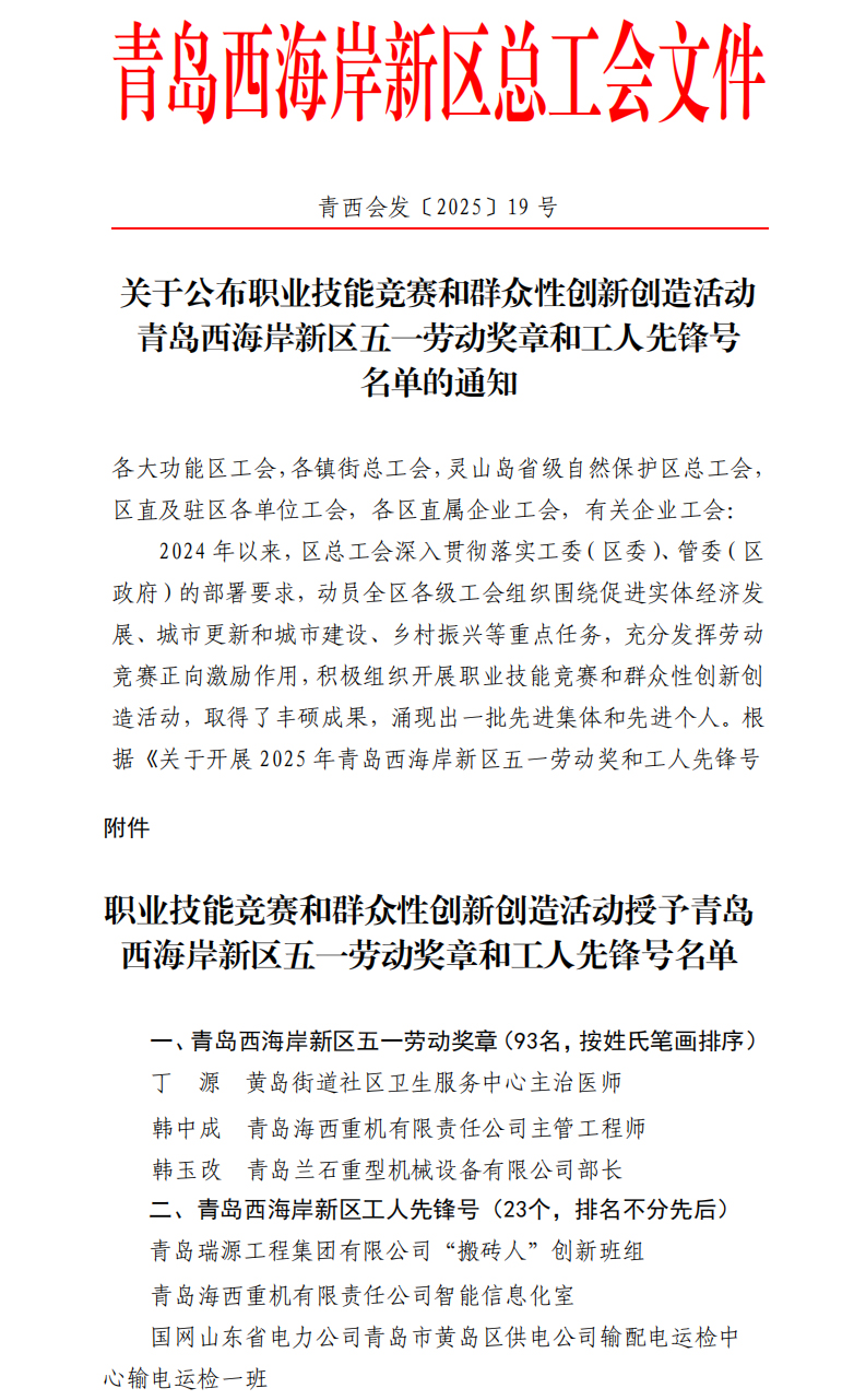 近日,海西重機智能信息化室榮獲西海岸新區(qū)“工人先鋒號”稱號,主管工程師韓中成榮獲西海岸新區(qū)“五一勞動獎?wù)隆薄_@一雙項殊榮的取得,既是對公司堅持創(chuàng)新驅(qū)動發(fā)展的認可,更是對新時代產(chǎn)業(yè)工人矢志技術(shù)報國的褒獎。