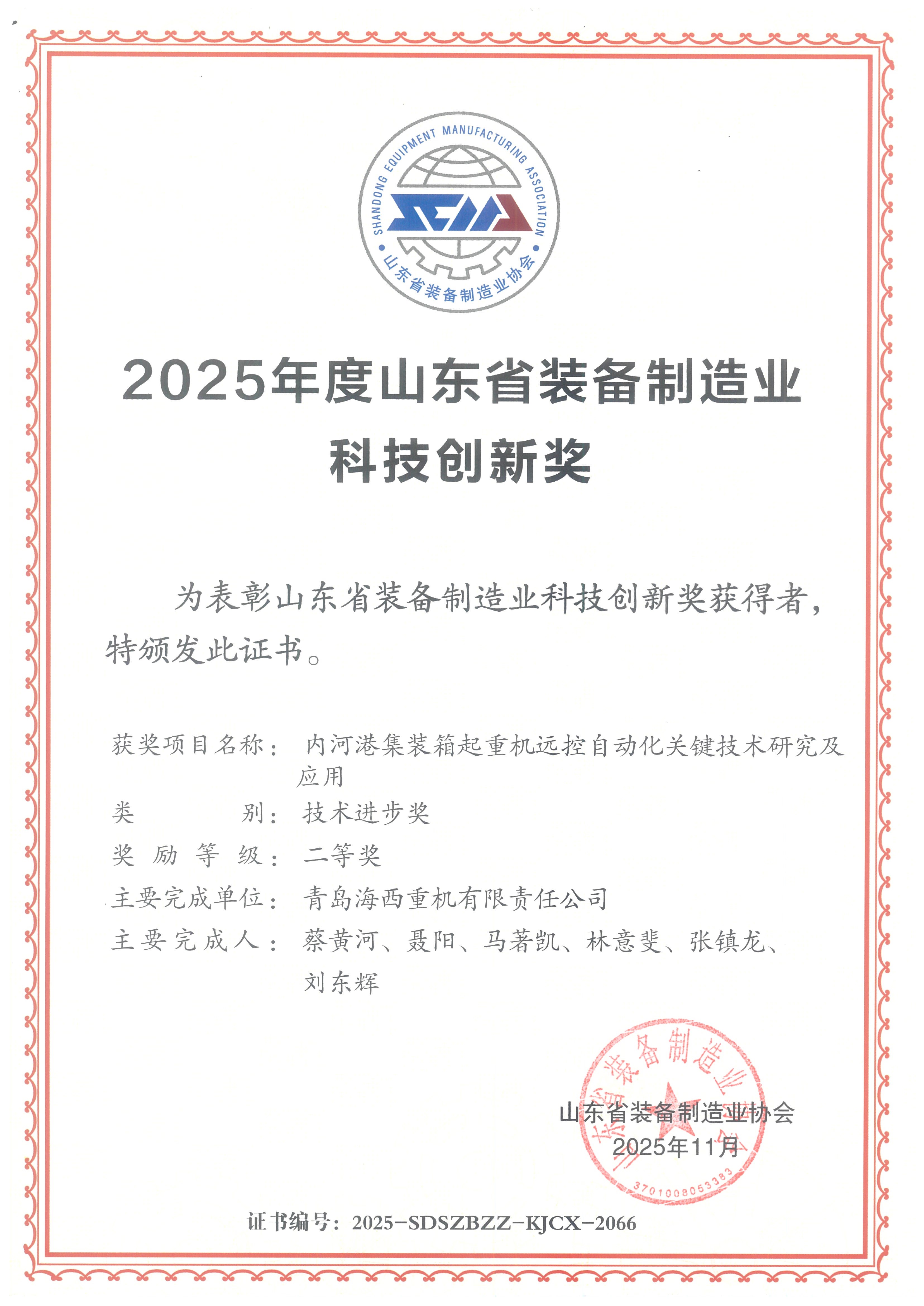 “內(nèi)河港集裝箱起重機(jī)遠(yuǎn)控自動化關(guān)鍵技術(shù)研究及應(yīng)用”——科技創(chuàng)新獎二等獎