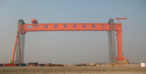 青島海西重機有限責(zé)任公司總承制的天津新港船舶重工有限責(zé)任公司臨港造修船基地首臺600噸×207米龍門吊,9月23日上午開始預(yù)提升,9月26日下午13點36分開始正式提升,于10月7日下午16點53分順利安裝到位,創(chuàng)下了國內(nèi)同類型龍門吊提升時間最短紀錄。