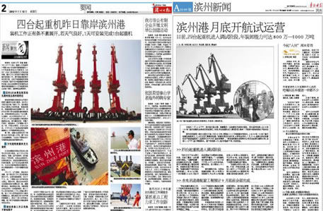 我公司為濱州港務(wù)有限責(zé)任公司承制的4臺(tái)MQ2533門座起重機(jī)于2012年7月10日運(yùn)抵濱州港碼頭后,引起了當(dāng)?shù)卣鐦O大關(guān)注。濱州市委書記、濱州市長(zhǎng)辦公室、濱州市委組織部、濱州市海事局、濱州市公安局、以及各縣區(qū)級(jí)領(lǐng)導(dǎo),先后到碼頭進(jìn)行參觀指導(dǎo),濱州日?qǐng)?bào)、魯北晚報(bào)更是多次到碼頭進(jìn)行采訪報(bào)道。
