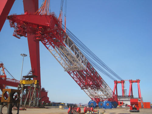 8月18日下午,青島海西重機(jī)在自己的突堤碼頭內(nèi)順利完成3600t浮吊1#臂架的最后吊裝。至此,3600t浮吊臂架安裝、鋼絲繩纏繞、臂架拉起的三步驟吊裝均已勝利完工。該臂架總重1200T,長130M,寬24米,高10米,是典型超長、超大、超重件,通過對國內(nèi)首創(chuàng)的突堤碼頭和自制1600t龍門吊的完美組合使用,海西重機(jī)自主創(chuàng)新以獨(dú)特的方式攻克了超大型構(gòu)件的吊裝以及吊裝中動態(tài)傾斜安裝的技術(shù)難題,突破了浮吊加駁船安裝浮吊的傳統(tǒng)安裝方式,降低了安裝成本,使施工安裝風(fēng)險得到充分可控,施工周期也大大縮短。